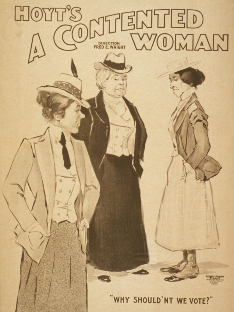 En el cartel de la obra de teatro “Una mujer contenta” de Charles H. Hoyt, de 1897, las sufragistas se meten las manos en los bolsillos. La Imprenta de Estados Unidos/Biblioteca del Congreso.