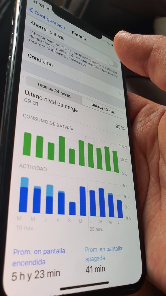 Una carga del 100% al comienzo de una jornada a las 07:00 AM me ha tenido de regreso en casa 10 horas después, tras un uso intensivo de WhatsApp, Twitter y navegación web, junto con 1 hora de Pokémon Go, en un rango del 50% al 30%.