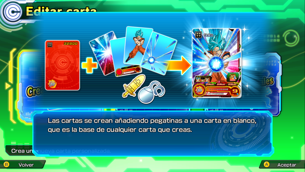 Debes armar tu mazo con 7 cartas, cada una tiene una ilustración repleta de información visual con un personaje de la serie cuyos diseños, aunque se trate de Krilin o Yamcha, parecen apoteósicos con efectos especiales, foils y vistosos marcos.