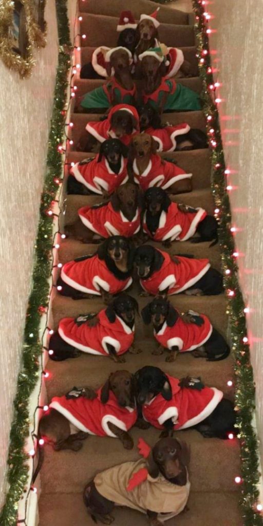 La alineación impecable en un sofá se debate la ternura de los perros salchicha posando ordenadamente en una escalera con sus atuendos de Navidad.
