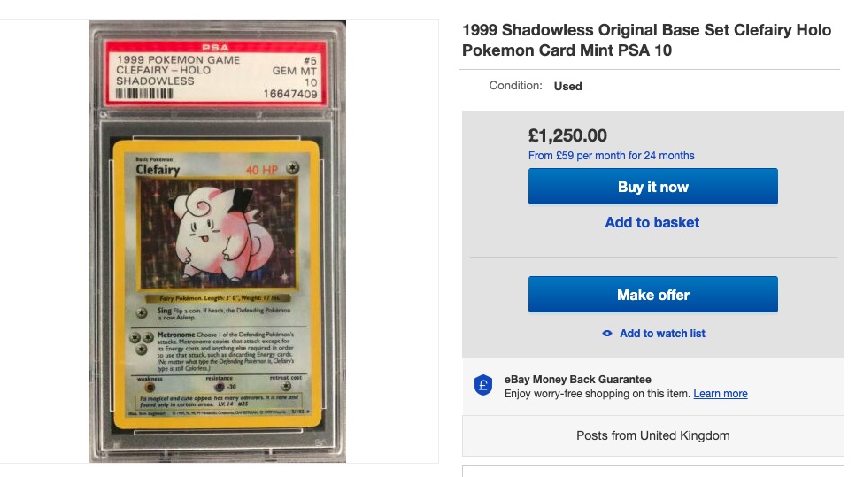 Otra carta Shadowless de alto valor, es un Clefairy del año 1999, que en el mismo sitio web cuesta £1.250, pero usada. Por lo tanto, si esta carta estuviera nueva, su valor sería aún mayor. En pesos chilenos: $1.088.956.