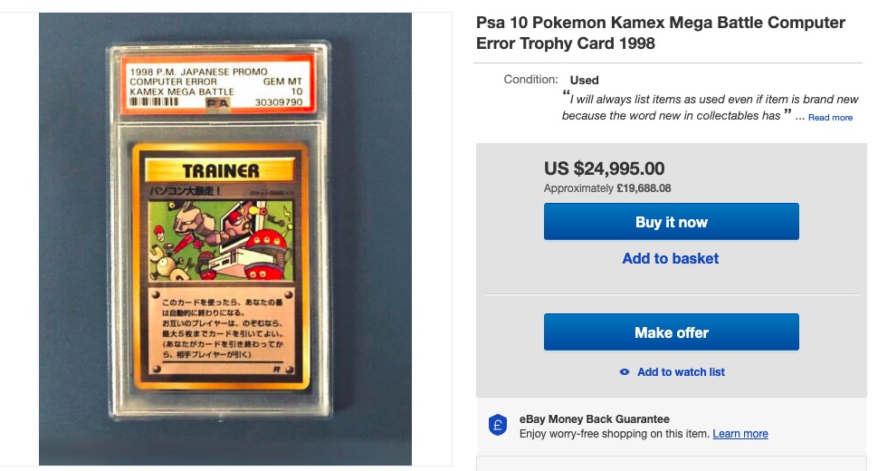 El valor se dispara en el sitio con una carta Pokémon de 1998, la Jamex Mega Batle qye se le entregó a los participantes de un torneo (en Japón) que llevaba el mismo nombre que la tarjeta. ¿El precio? $USD 24.995. Unos $17.088.956 en Chile.