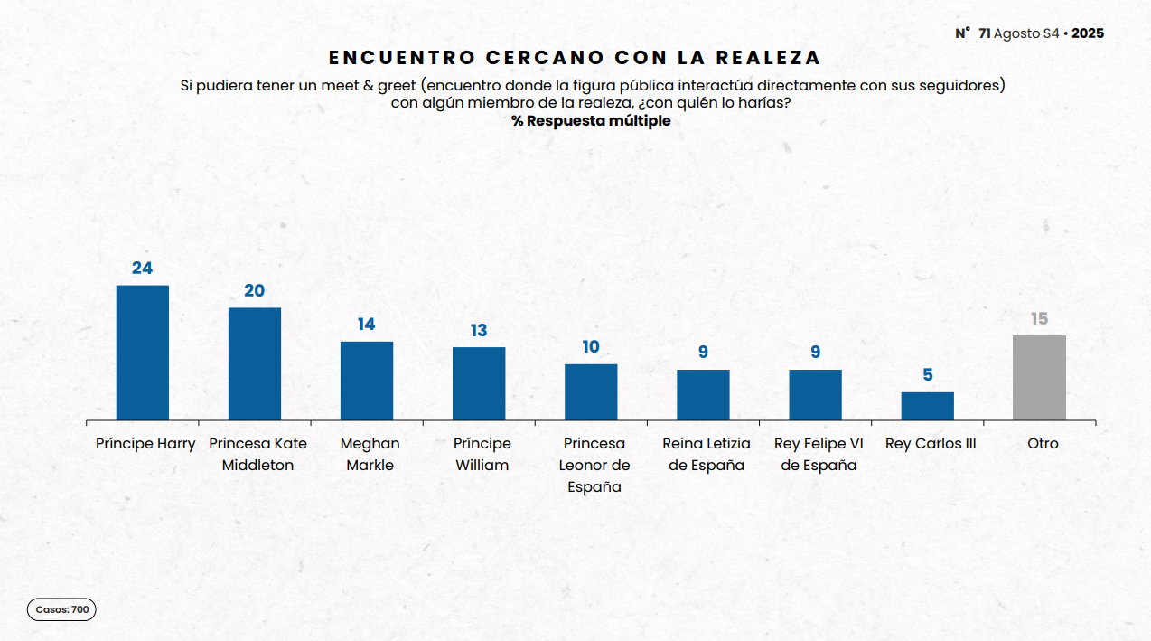 El príncipe Harry se roba el trono con un 24% de las preferencias entre quienes desearían un meet & greet con él, seguido de cerca por Kate Middleton con un 20%.