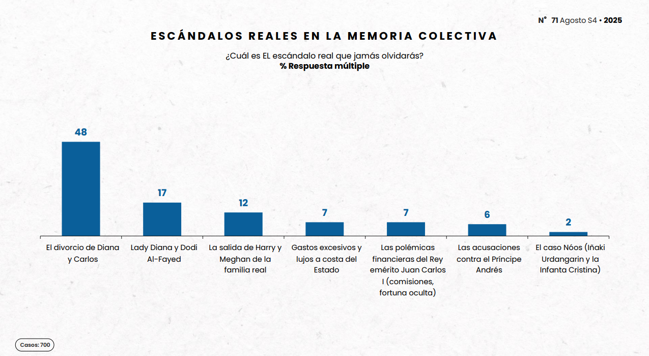 El drama también marca huella: el divorcio de Diana y Carlos es recordado por un 48% como el mayor escándalo real. En cuanto a producciones favoritas sobre el tema, destacan la película Diana (36%) y la serie The Crown (31%).