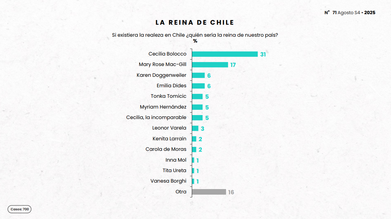 ¿Qué momentos de la historia guarda la memoria colectiva de los chilenos? ¿Existe interés en los temas de la realeza? La respuesta es sí, y si Chile tuviera una corona, la reina sería la Miss Universo Cecilia Bolocco, según revela la última encuesta semanal 5C, que la posiciona como la favorita para encarnar una monarquía local.