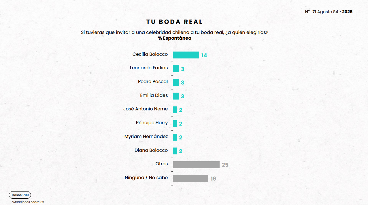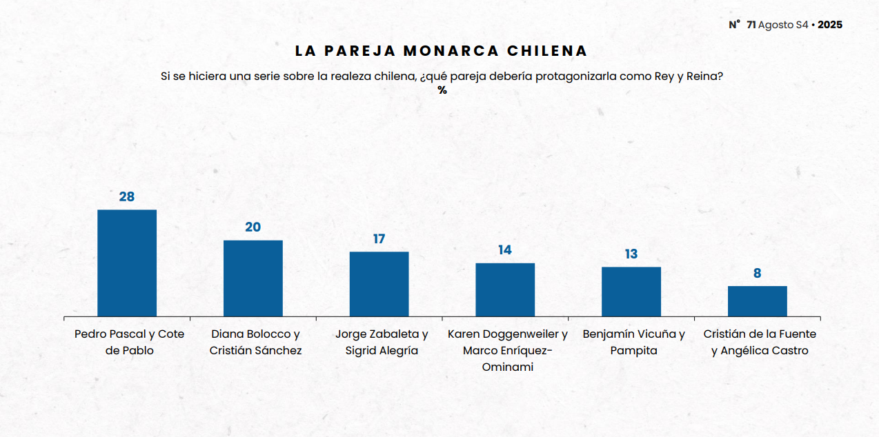 “Estos resultados muestran que la realeza, aunque lejana, conecta con nuestra cultura desde la nostalgia y la fantasía. Bolocco simboliza glamour, éxito internacional y cercanía, mientras que Pascal y De Pablo representan orgullo nacional y proyección global”, explica el académico y especialista en opinión pública, magíster en Comunicación Estratégica, Rodrigo Durán Guzmán.