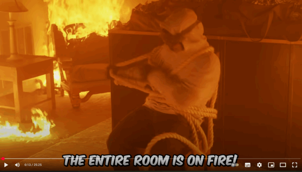 El desafío consistía en desatarse por sí mismo y recoger el dinero dispuesto sobre una mesa mientras la “casa” ardía.