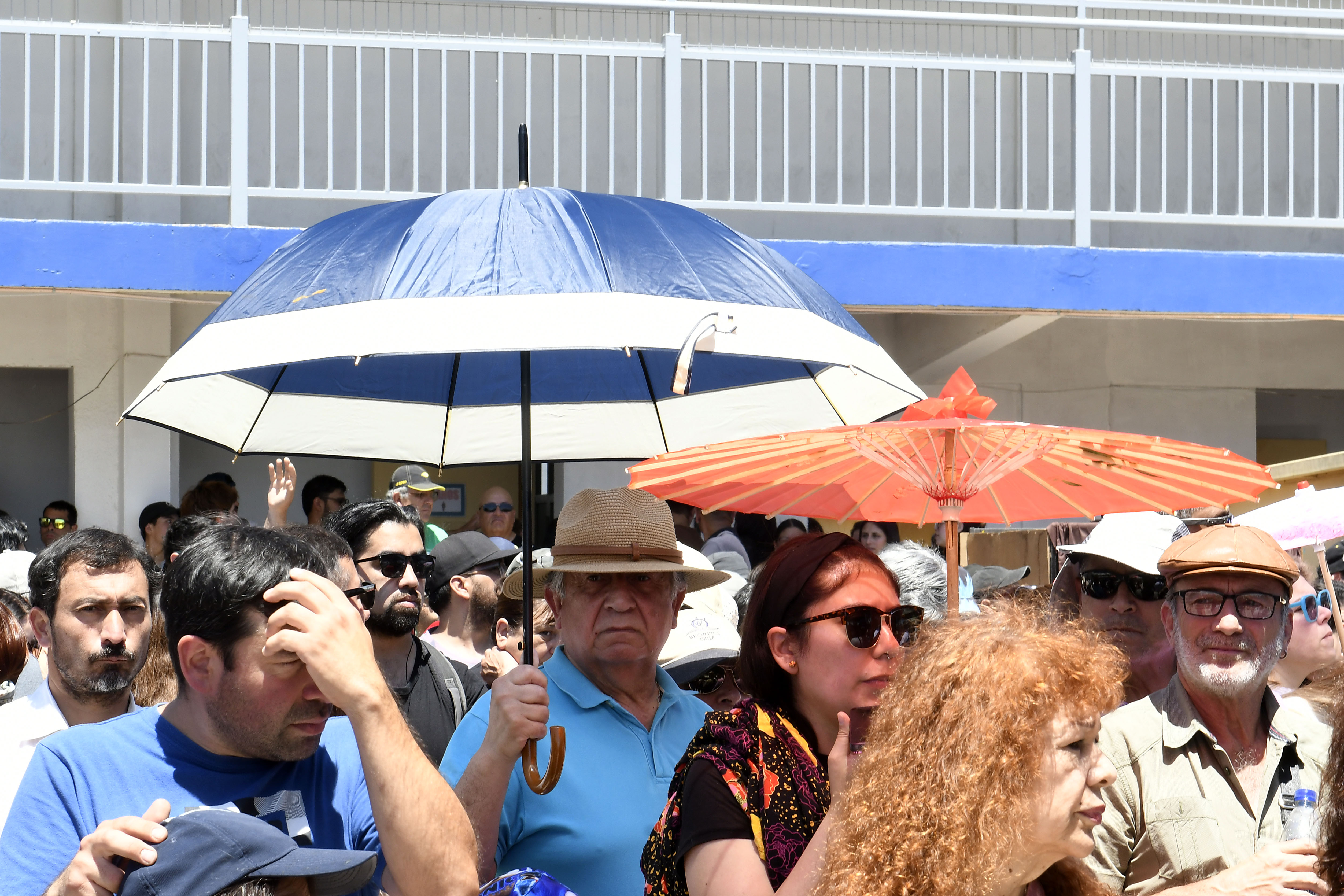 Personas con paraguas se cubren de las altas temperaturas, durante las elecciones presidenciables y parlamentarias 2025.Crédito:PABLO OVALLE ISASMENDI/ AGENCIAUNO