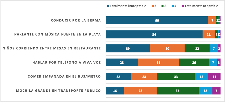Dos prácticas concentran un nivel de desaprobación casi unánime: conducir por la berma y poner música a alto volumen en la playa. El 90% y el 84% de los consultados, respectivamente, consideran estas conductas totalmente inaceptables.