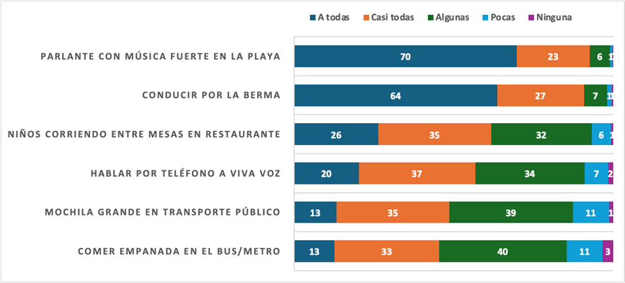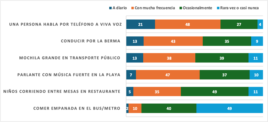 La encuesta también analizó la frecuencia, que reveló que la experiencia cotidiana modifica el juicio moral: Hablar por teléfono a viva voz es la más habitual, siendo seguida por la música fuerte en playas y la invasión de bermas por automovilistas, mientras que, por el contrario, acciones como comer empanada en el bus son menos frecuentes, con casi la mitad ubicándola en el rango de “rara vez”.